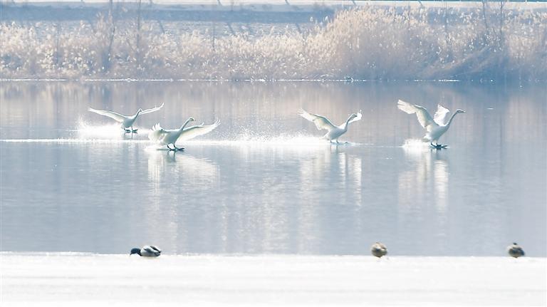 臨夏州永靖縣鹽鍋峽鎮(zhèn)境內(nèi)的黃河八盤峽水庫(kù)成為天鵝等候鳥越冬的樂園