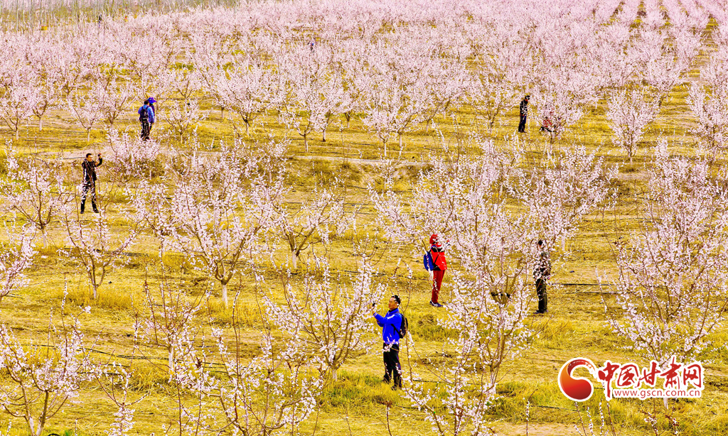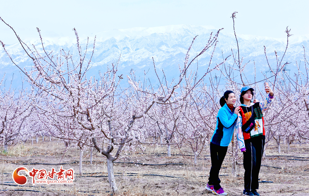 4月3日,游客在祁連山下的甘肅張掖甘州區(qū)金滿園千畝杏園種植基地里賞花和拍照留念。