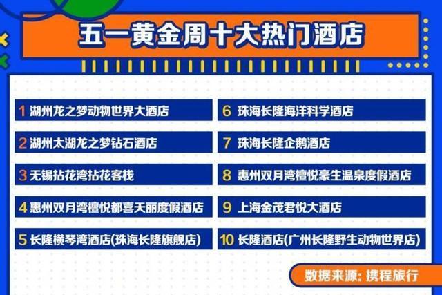 數(shù)據(jù)顯示,攜程酒店預(yù)訂間夜以及GMV在假期前三天連續(xù)突破平臺歷史峰值,對比2019年同期,單日訂單量增幅最高達70%。湖州龍之夢動物世界大酒店、湖州太湖龍之夢鉆石酒店、無錫拈花灣拈花客棧、惠州雙月灣檀悅都喜天麗度假酒店、長隆橫琴灣酒店(珠海長隆旗艦店)、珠海長隆海洋科學(xué)酒店、珠海長隆企鵝酒店、惠州雙月灣檀悅豪生溫泉度假酒店、上海金茂君悅大酒店、長隆酒店(廣州長隆野生動物世界店)為今年“五一”黃金周熱門酒店TOP10。