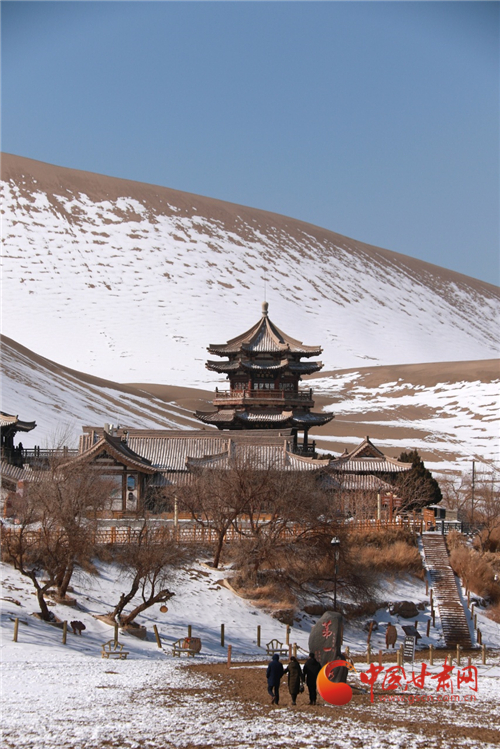 雪后的甘肅省敦煌市鳴沙山月牙泉景區(qū)景色如畫、銀裝素裹,美不勝收。