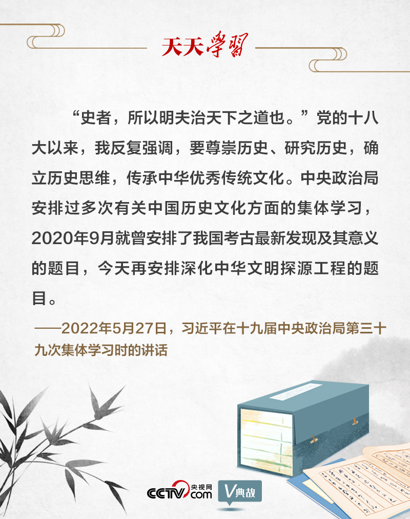 為深入了解中華文明五千多年發(fā)展史,推動把中國文明歷史研究引向深入,推動全黨全社會增強歷史自覺、堅定文化自信,2022年5月27日,十九屆中央政治局就深化中華文明探源工程進(jìn)行第三十九次集體學(xué)習(xí)。習(xí)近平總書記引用古語“史者,所以明夫治天下之道也”,強調(diào)要尊崇歷史、研究歷史,確立歷史思維,傳承中華優(yōu)秀傳統(tǒng)文化。