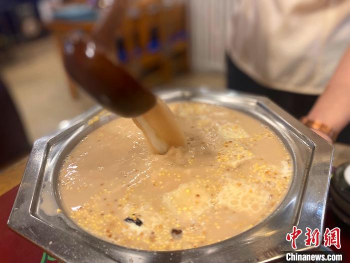 5月28日,呼和浩特市一家奶茶店里,服務(wù)員薩拙拉將黃油、炒米等奶茶“伴侶”放入熱鍋中。中新社記者 張瑋 攝
