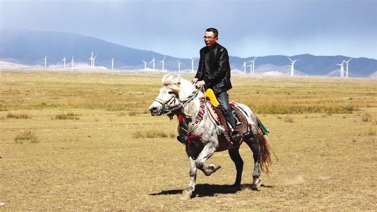 驅(qū)車向草原腹地進發(fā),遠遠就能看見有人在馴馬。馴馬者房利軍和他的坐騎“尕青”仿佛“人馬合一”,同呼吸、共步調(diào),一遍遍練習,像走,更像飛。這便是傳說中的走馬文化,和跑馬的加速度不同,走馬不管是走還是跑,都是快步勻速,短途速度快,長途耐力強,騎乘平穩(wěn),姿態(tài)優(yōu)美,觀賞性強。在牧區(qū),走馬實用性強,深受當?shù)厝藲g迎。曾有專家稱,“馬踏飛燕”的“馬”即為走馬。每天,和武威天祝一山之隔的這片草原,都與房利軍有關,在這里,他專心馴馬,而他的500只羊則在一旁撒歡。尤其從高空俯瞰,草原牧羊的畫面甚是壯觀??赐犟Z馬,房利軍騎馬帶路,采訪車沿著馬道回到了“家”。