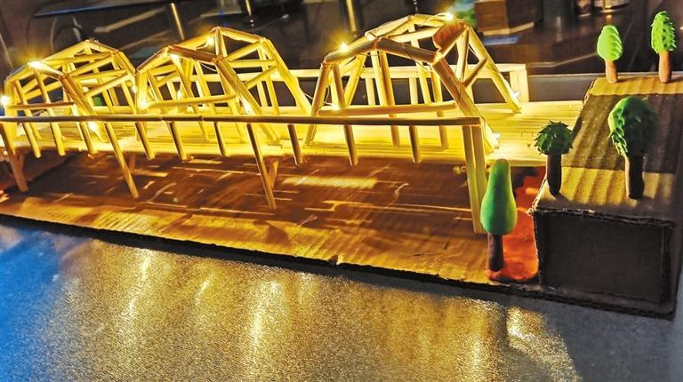 “平時去看中山橋只覺得它很美,現在覺得當時建造它一定很不容易。”馬靜怡同學和媽媽用一次性筷子制作的中山橋模型,與實物外觀頗為相似,為了呈現中山橋拱形鋼架的效果,馬靜怡裁筷子再拼粘費了一番工夫。大橋模型制作好了,她對中山橋也有了更深的認識。