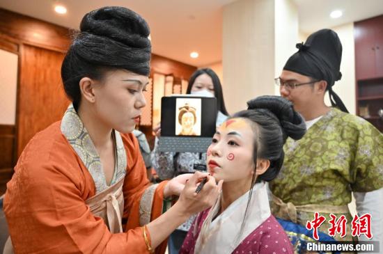 10月9日晚,廣西南寧市一攝影棚內(nèi),南寧傳統(tǒng)服飾復(fù)原團隊化妝師鄭若楠依據(jù)陶俑文物圖片為模特上面妝。