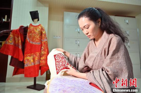 蔣雨林展示其手工復(fù)原制作的漢服飾紋路。