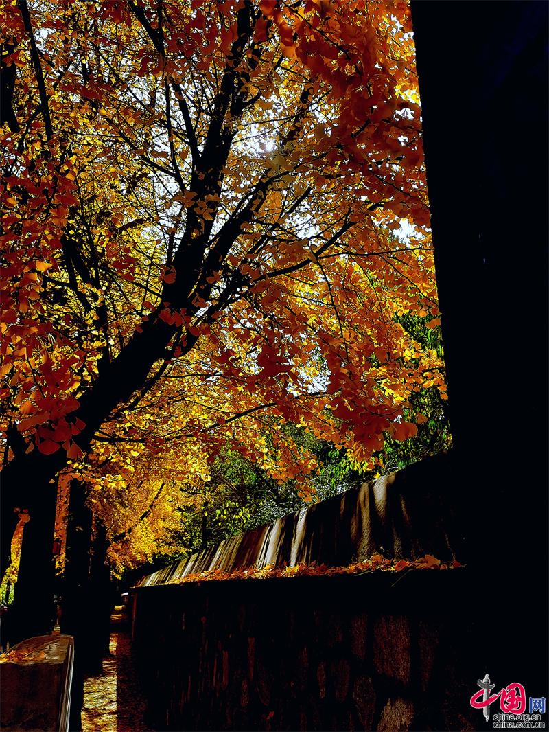 而圓明園的秋色,同樣不落秋之美。黃葉與殘?jiān)嘁r,透露出特有的滄桑與悲涼。它美得那么寂寞,那么孤獨(dú)。只有在銀杏大道上,才能聽到喧鬧之中,那熙熙攘攘的歡呼之聲。