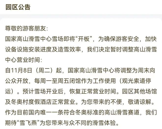 根據(jù)公告,自11月8日(周二)起,國(guó)家高山滑雪中心將調(diào)整為周末向公眾開(kāi)放,每周一至周五閉館作為工作使用(觀光索道停運(yùn))。預(yù)計(jì)雪場(chǎng)開(kāi)業(yè)后,恢復(fù)正常營(yíng)業(yè)時(shí)間。目前,“雪飛燕”已對(duì)外開(kāi)放,如果纜車(chē)開(kāi)放,便可以乘坐纜車(chē)上到山頂。
