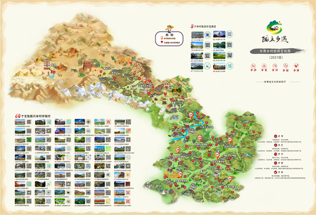 ——鄉(xiāng)村旅游。甘肅旅游,70%以上的旅游資源集中在農(nóng)村。近年來,全省文旅系統(tǒng)累計投資12億元,共打造省級鄉(xiāng)村旅游示范村310個,創(chuàng)建鄉(xiāng)村旅游示范縣14個,文旅振興鄉(xiāng)村樣板村120個,培育鄉(xiāng)村旅游合作社470個,38個村入選建全國鄉(xiāng)村旅游重點村,3個鄉(xiāng)鎮(zhèn)入選全國首批鄉(xiāng)村旅游重點鄉(xiāng)鎮(zhèn)、6個村入選第三批全國鄉(xiāng)村旅游重點村名錄,2家民宿創(chuàng)建為首批全國甲級旅游民宿。美麗鄉(xiāng)村及特色民宿已成為省內(nèi)外游客停留和消費的首選地,甘南扎尕那村、隴南花橋村、慶陽天富億村、天水孫集村、平?jīng)鲽P凰村、臨夏大川村等一大批示范村已成為省內(nèi)外游客的熱門打卡地,美麗鄉(xiāng)村正在成為全省綠色經(jīng)濟的新型引擎。其中,2019年,甘肅鄉(xiāng)村旅游接待游客5918萬人,收入175億元,鄉(xiāng)村旅游占到全省文化旅游半壁江山,讓老百姓身邊青山綠水真正成了“金山銀山”。2020年全國鄉(xiāng)村旅游及民宿工作現(xiàn)場會、“一帶一路”美麗鄉(xiāng)村國際論壇在甘肅舉辦,甘肅鄉(xiāng)村旅游一枝獨秀、異軍突起,受到社會各界高度贊揚和廣泛關(guān)注。2021年,甘肅鄉(xiāng)村旅游游客接待量達1.31億人次,實現(xiàn)鄉(xiāng)村旅游收入390.33億元,分別恢復(fù)至疫情前的103.20%和114.80%,顯著高于國內(nèi)旅游的整體恢復(fù)比例。值得一提的是,全省文旅系統(tǒng)在大力發(fā)展鄉(xiāng)村旅游的同時,堅持把非遺工坊建設(shè)也作為重中之重,積極創(chuàng)新探索“非遺+扶貧”模式,打造融入當(dāng)代審美的非遺品牌,搭建扶貧產(chǎn)品通往市場的平臺,全省累計建成非遺扶貧就業(yè)工坊106家,共有11家非遺工坊納入全國消費扶貧產(chǎn)品目錄和數(shù)據(jù)庫,認(rèn)定省級以上非遺就業(yè)工坊93家,涉及各級傳統(tǒng)技藝類非遺代表性項目77項,分布在全省11個市州46個脫貧縣區(qū),吸納就業(yè)6000多人;年均組織開展“非遺過大年、文化進萬家”民俗展演活動1000多場次,極大豐富了廣大群眾精神文化生活。