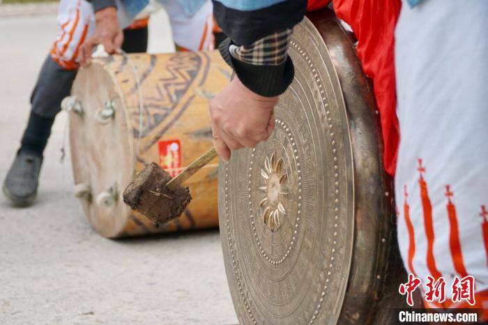 圖為白褲瑤居民正在敲擊銅鼓。韋國政 攝