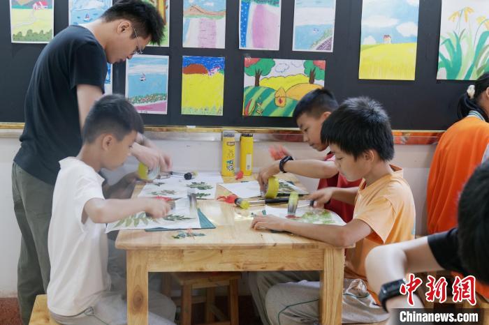 距離村口不遠處的六禾畫社中,傳來一陣“咚咚”的敲擊聲。屋內,十幾名孩童手拿小錘子,在白色卡紙上拓印葉片的形狀。