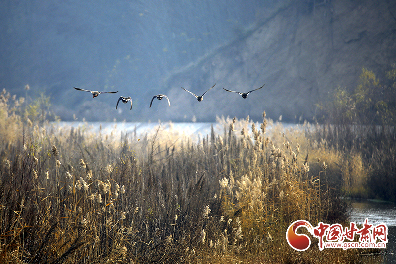 冬日的平?jīng)鍪谐缧趴h,無人機(jī)鏡頭下的唐帽山山巒疊嶂、俊秀奇威,高大的樹木直插云霄,在云霧繚繞中宛若仙境;汭水河畔,成群的綠頭鴨時而佇立枝頭,時而輕舞飛翔,時而戲水覓食。