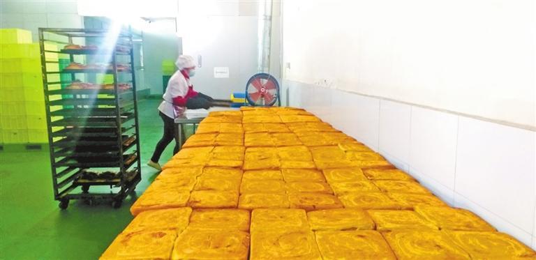 “揉面、搟面、抹餡料……”手工制作線上一位大姐告訴記者:“目前我們有手工生產(chǎn)和全自動(dòng)生產(chǎn)兩條線,分別生產(chǎn)千層餅傳統(tǒng)面點(diǎn)和玫瑰餅等新型糕點(diǎn)。傳承祖上燒餅制作技藝,工人們要在前一晚和好面,面團(tuán)經(jīng)過(guò)一夜的醒發(fā)后,天剛亮再交由經(jīng)驗(yàn)老到的師傅打堿,揉面、搟面,涂抹苦水玫瑰醬、胡麻顆粒、香豆粉、姜黃粉等餡料,卷制成型,在千層餅正面撒上芝麻,就可以上烤箱了,大約每天上午10點(diǎn)前烘烤好的千層餅會(huì)送往永登各銷(xiāo)售點(diǎn)。”
