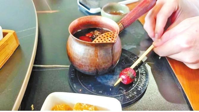 “‘茶圣’陸羽的《茶經·五之煮》記載,煮茶的時候會放蔥、姜、棗、橘皮、茱萸、薄荷等佐料,所以現(xiàn)在罐罐茶所添加的配料,如紅棗、枸杞、桂圓、葡萄干、菊花、冰糖等,其實就是最原始的煮茶法的延續(xù)。”唐陳虓說。