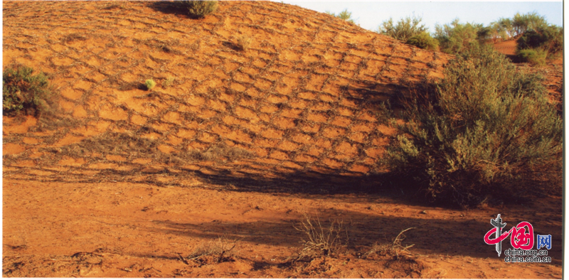 小小的“麥草方格”不僅阻止了流沙,防止了荒漠化,還加速了當?shù)亟洕陌l(fā)展。“麥草方格”固沙法即:將廢棄的麥草呈方格狀鋪在沙面上,然后用鐵鍬軋進沙中,留麥草的三分之一或一半立在四周,并在方格中植入治沙人經九次試驗成功培育出的花棒、檸條等沙生植物,腐爛干枯的麥草還作為肥料滋養(yǎng)植物的生長。