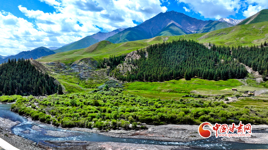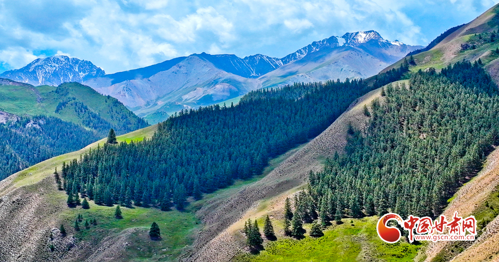 6月29日,在祁連山國家公園甘肅省張掖市肅南裕固族自治縣大河鄉(xiāng)段,藍天白云下,巍峨壯麗的祁連山蒼松翠柏,水光粼粼,構成一幅美麗的畫卷。