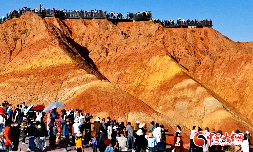 張掖七彩丹霞地貌群以其層理交錯、巖壁陡峭、氣勢磅礴、造型奇特、色彩斑斕而稱奇。2020年,國家文化和旅游部確定張掖七彩丹霞景區(qū)為國家5A級旅游景區(qū);同年,張掖地質(zhì)公園獲批“聯(lián)合國教科文組織世界地質(zhì)公園”。據(jù)七彩丹霞景區(qū)管委會統(tǒng)計,當(dāng)日是中秋國慶假期第二天,該景區(qū)游客量達(dá)29000多人?!?/p>