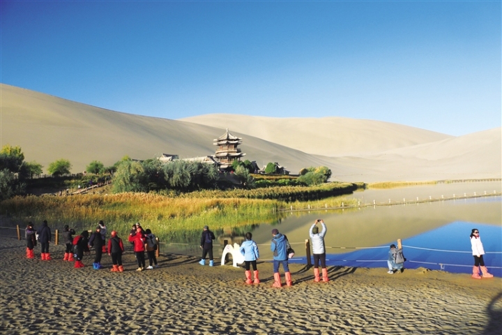 敦煌市文旅部門統(tǒng)計(jì)數(shù)據(jù)顯示,10月7日以來,鳴沙山·月牙泉景區(qū)日均接待游客近萬人。