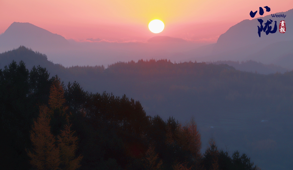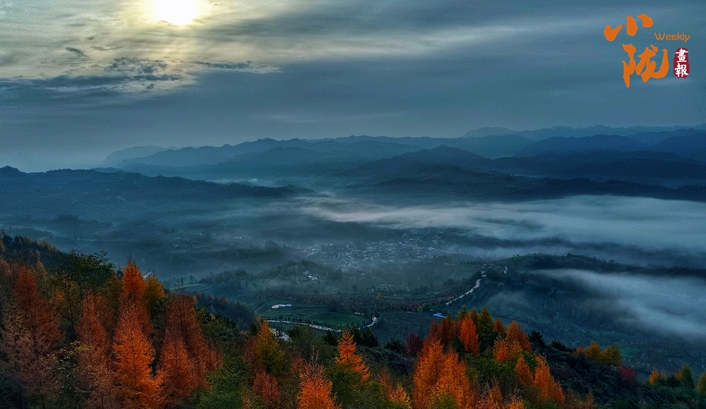 天空中布滿了烏云,云隙中的陽(yáng)光和從四面八方漫過來的云霧、滿山彩林,把云華山點(diǎn)綴得像一幅筆墨清爽、疏密有致山水畫。