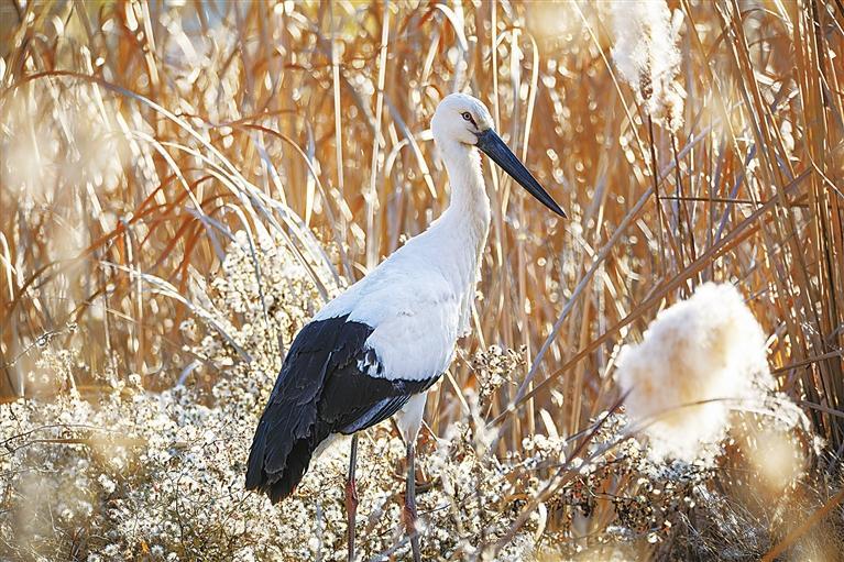 東方白鸛是一種大型涉禽,為鸛形目鸛科鳥類。其體態(tài)優(yōu)美,成鳥體長超過1米,黑翅白體,赤腳長喙,棲息于開闊的沼澤、湖泊和潮濕草地。東方白鸛是少見的旅鳥,因繁殖分布區(qū)域狹窄,野生種群數(shù)量極為稀少,在《世界自然保護(hù)聯(lián)盟瀕危物種紅色名錄》中屬于瀕危等級,是我國一級重點保護(hù)野生動物,有“鳥界國寶”“鳥類大熊貓”之稱。