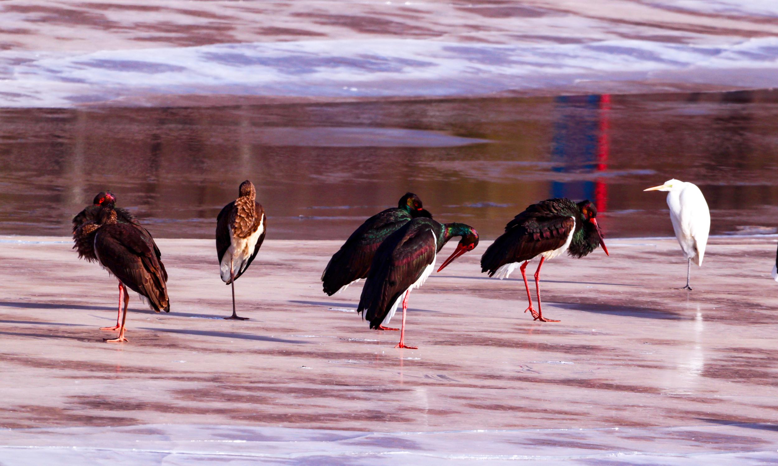 一群黑鸛在汭河歇息