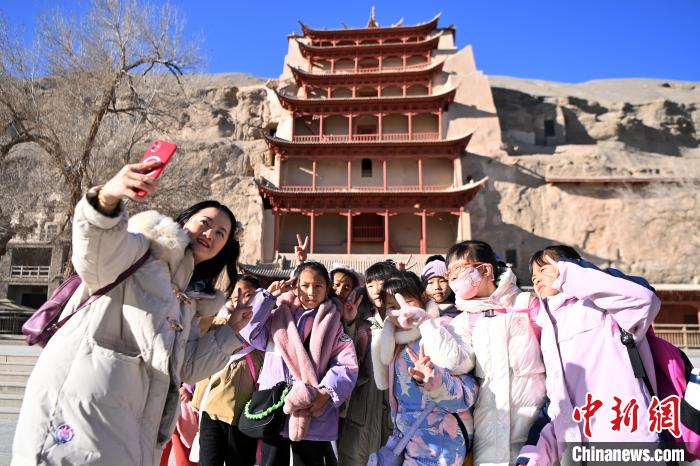 敦煌文化研學正逐步成為敦煌旅游新時尚,莫高窟成為“研學養(yǎng)身養(yǎng)心”的學堂之一。連日來,中新社記者來到冬日的莫高窟,沒有了夏日的人聲鼎沸和如長龍的隊伍,多了更多青春面孔,穿著絢麗服飾、背著書包的學生,點綴著沉悶的戈壁土黃色。