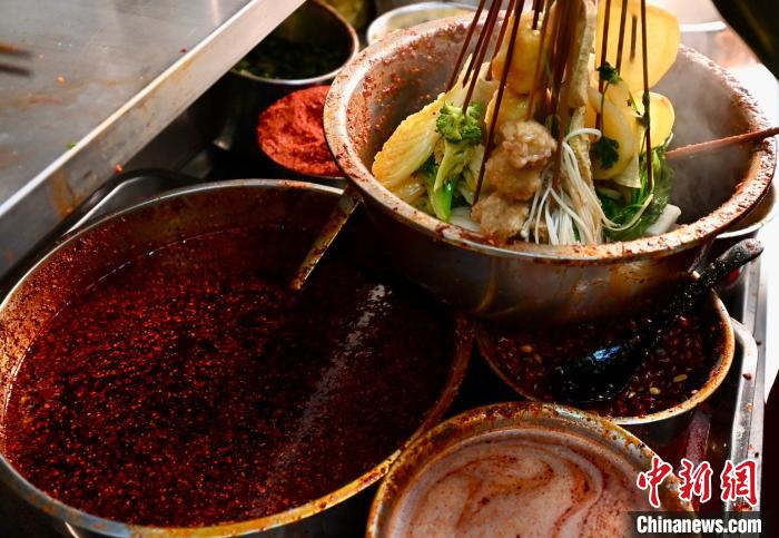 “我們會一次性熬制可以用20天左右的老料,保存起來,煮湯時(shí)挖取幾勺,加水熬制數(shù)小時(shí),才能烹飪出濃濃的湯底,煮出來的菜才香。”楊繼兵說,每家麻辣燙的紅油辣子也各有“獨(dú)家秘方”,大多用八角、香葉、花椒等香料磨粉調(diào)味,加一些白芝麻,再用炸香的熱油一潑,辣香味隨之襲來。