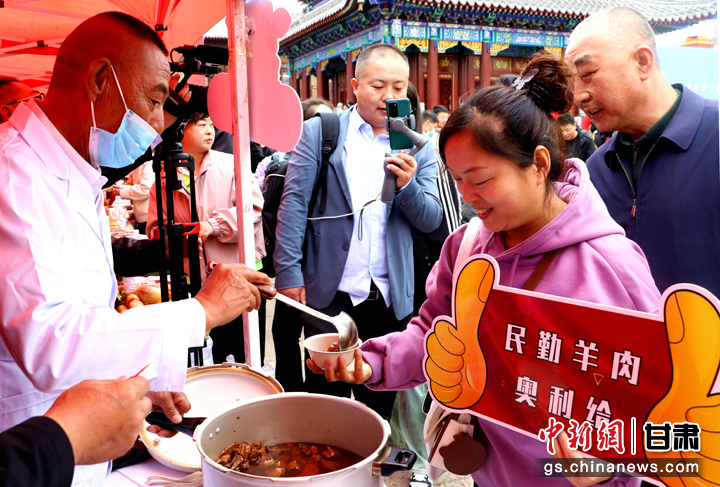 3月下旬,民勤縣在天水啟漢樓廣場舉行推介會,宣傳本地旅游資源和農特優(yōu)產品。圖為游客一邊品嘗民勤羊肉,一邊聆聽美食背后的文化和故事。 周旦 攝