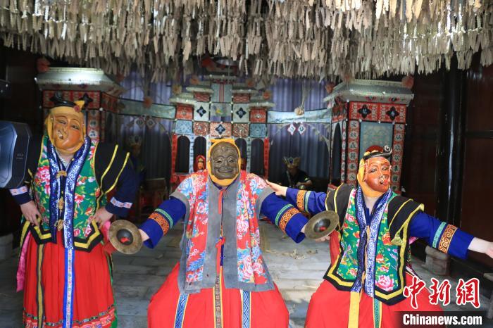 頭戴面具的儺戲師在貴州省銅仁市德江縣表演儺戲。李潤 攝