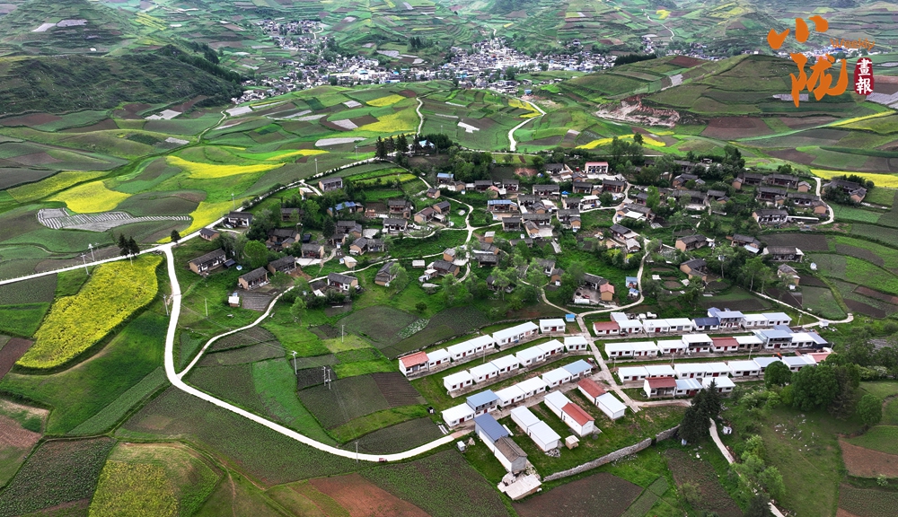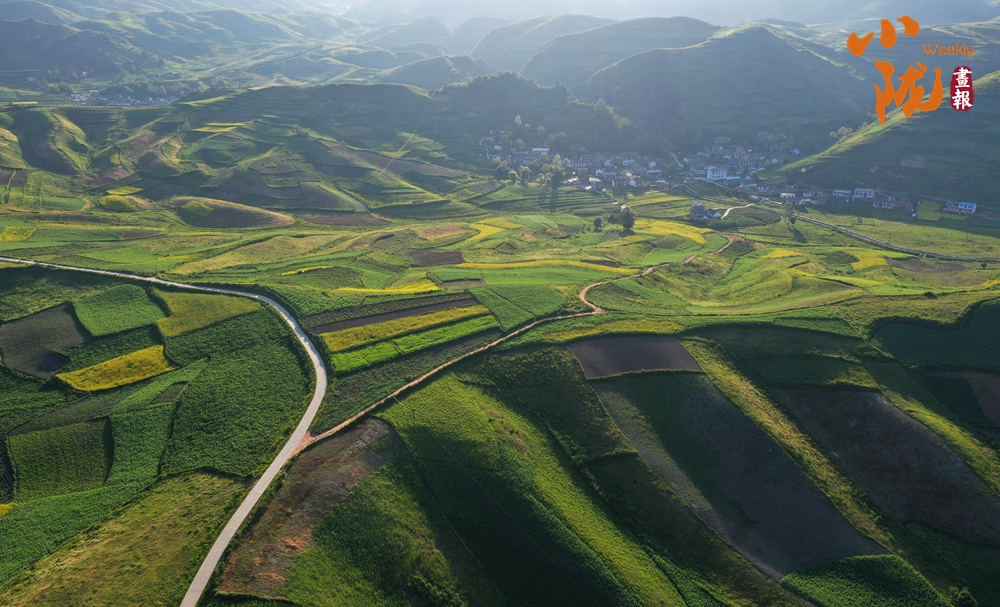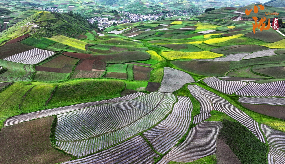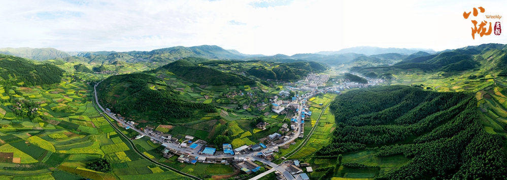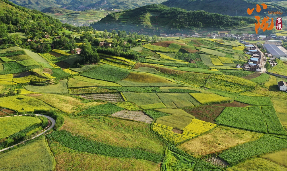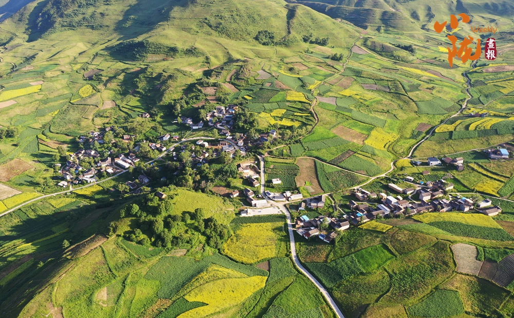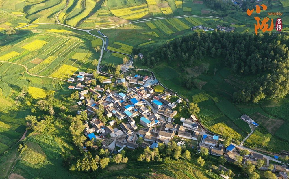 從空中俯瞰,阡陌縱橫與遠處連綿起伏的青山,錯落有致的民居交相呼應,勾勒出一幅美麗的“田園畫卷”。
