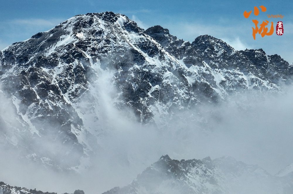 雪山山巒間,云霧回旋飄動,彌漫舒展,如海浪起伏、波濤滾滾一般,與湛藍天空相互映襯,壯美如畫。