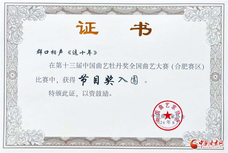據(jù)了解,中國曲藝牡丹獎,是全國性曲藝藝術(shù)專業(yè)最高獎項。第十三屆中國曲藝牡丹獎全國曲藝大賽(合肥賽區(qū)),由中國文學(xué)藝術(shù)界聯(lián)合會、中國曲藝家協(xié)會、安徽省文化和旅游廳、安徽省文學(xué)藝術(shù)界聯(lián)合會、合肥市人民政府主辦,于8月18日至23日舉辦,是本屆牡丹獎四個分賽區(qū)中的最后一站,主要面向相聲、小品、“三書”類節(jié)目。中國曲協(xié)18家團(tuán)體會員、中國曲協(xié)香港會員分會、中國曲協(xié)有關(guān)專業(yè)委員會、中直文藝院團(tuán)以及省級文藝院團(tuán)報送的節(jié)目參賽。期間,共收到480多個節(jié)目,48個節(jié)目入圍,《這十年》為甘肅地區(qū)唯一一件入圍作品。