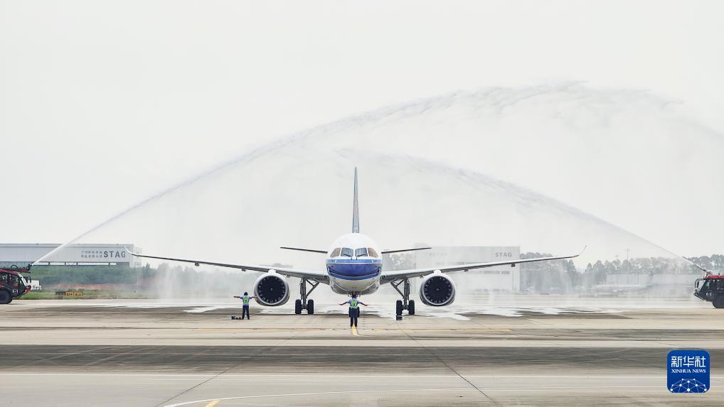 8月29日,南航首架C919國(guó)產(chǎn)大飛機(jī)在廣州白云國(guó)際機(jī)場(chǎng)緩緩穿過(guò)“水門(mén)”。新華社發(fā)