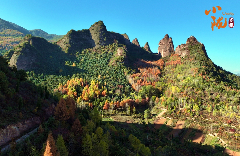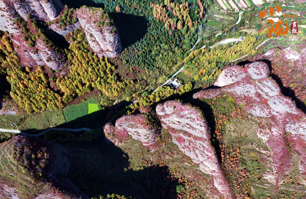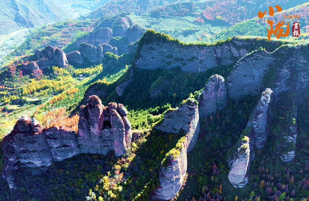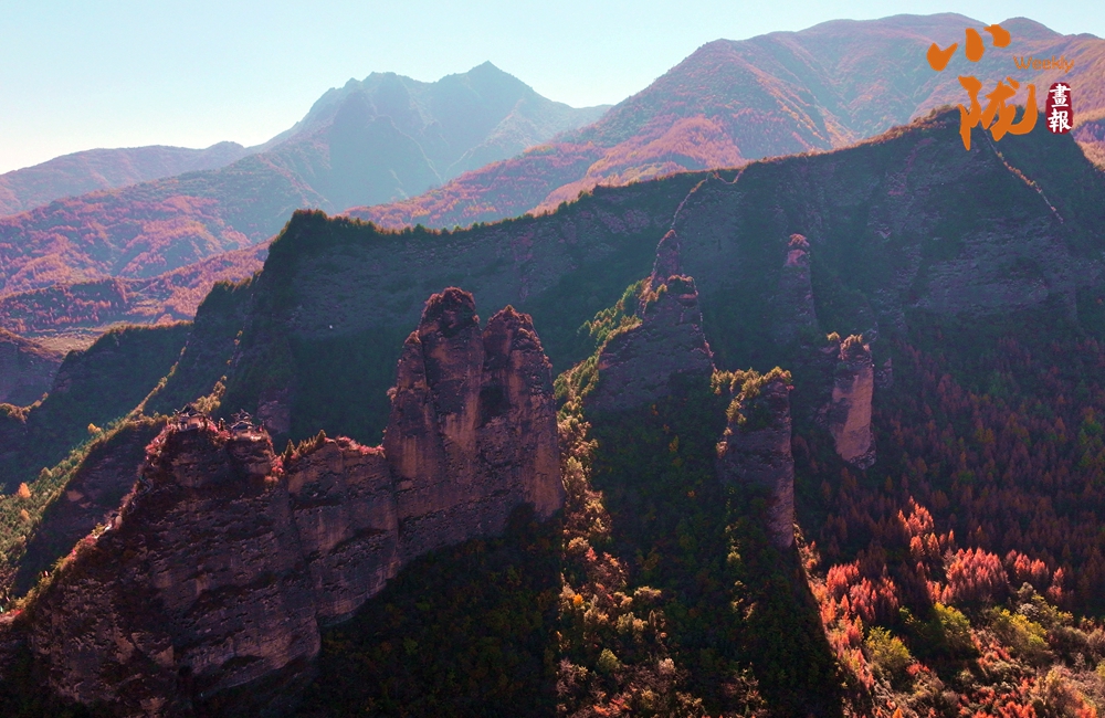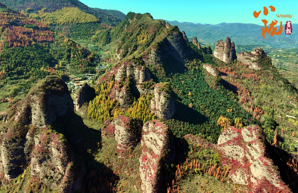 站在山頂,俯瞰四野,山勢挺拔,直插云霄,山巒被紅、黃、橙、綠各種顏色渲染,盡顯山巒疊翠之美。
