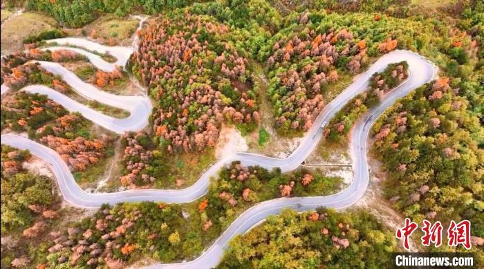 初冬時節(jié),甘肅省隴南市武都區(qū)公路旁仍然一派秋日景象,黃紅綠相間的公路甚是好看,公路在暖陽的擁抱下,緩緩鋪展向遠方。圖為蜿蜒公路兩旁五彩繽紛的景色。龍金鈴 攝