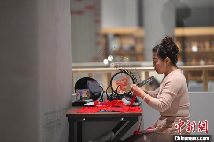 11月23日,甘肅省蘭州市楊樹珍剪紙工作室內(nèi),楊樹珍團(tuán)隊(duì)成員制作剪紙漢服作品。中新社記者 李亞龍 攝