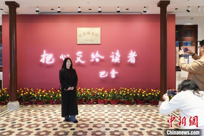 11月25日,巴金先生誕辰120周年,巴金圖書館在上海揭幕,實現(xiàn)了巴老生前想要創(chuàng)辦一座圖書館的心愿。圖為觀眾在巴金圖書館留影。中新社記者 張亨偉 攝