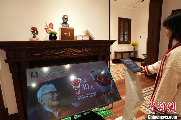 圖為觀眾為巴金送上“電子花”。中新社記者 張亨偉 攝