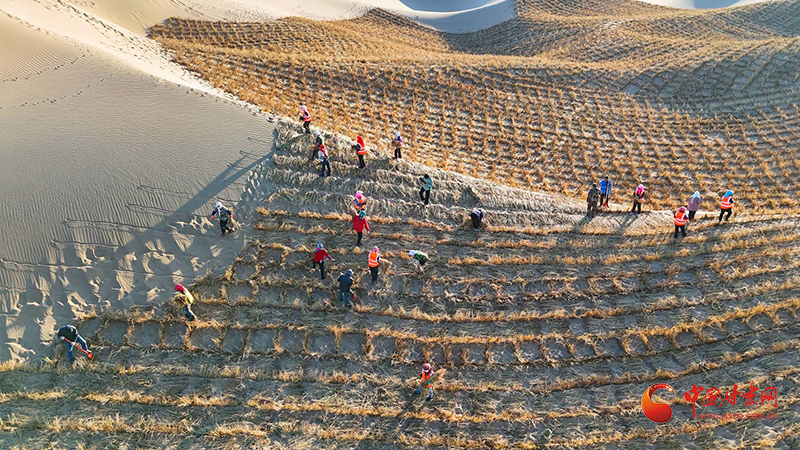 防沙治沙又一季,綠化造林年復(fù)年。這幾天,在金塔縣城至大墩門公路“三北”工程防沙治沙現(xiàn)場(chǎng),一捆捆稻草正排著隊(duì)乘坐無人機(jī)前往沙漠深處。走進(jìn)壓沙現(xiàn)場(chǎng),大家拉草埋沙,手提肩扛,或俯身鋪草,或揮鍬壓埋、填沙整型,分工明確、干勁十足。一臺(tái)壓沙車正在作業(yè),車輪駛過,稻草沙障便被植入沙漠里,劃線、鋪草、壓草,整個(gè)流程一氣呵成,效率大大提高。