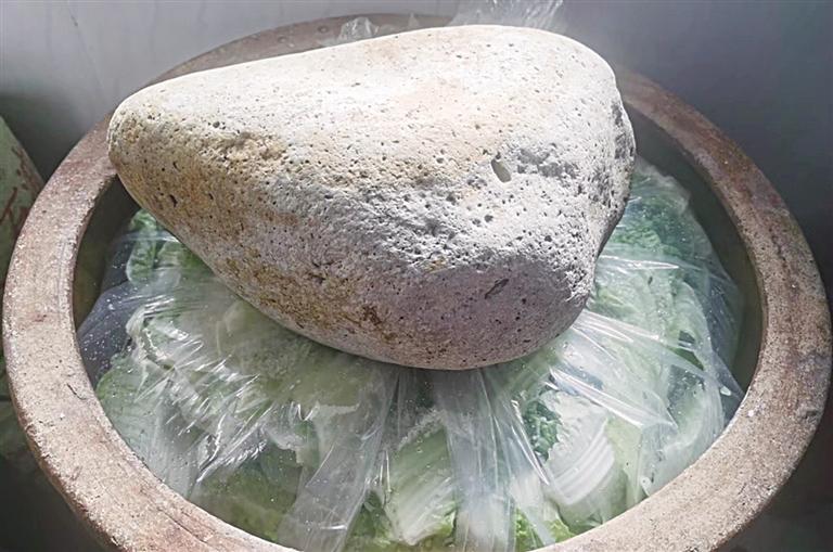 交談中,菜市場爺爺奶奶輩的老人說,除了囤好大白菜,“一口酸菜缸,一塊腌酸菜用的大石頭”也必不可少。“前一年缸里的菜吃完后,要把空缸倒扣在地面上,接上地氣,除去缸中的異味,然后洗干凈,晾干,來年再用。”老人家說,傳統(tǒng)的近半人高的醬色大缸一般都是家里的老人留下來的,那時候大家的生活條件不好,一家人的美食,都被腌制在壇壇罐罐里,甚至搬家都舍不得丟棄這口缸。腌菜用的壓菜石也是有講究的,先要夠分量,太小了壓不實,太大了不方便取菜,也有人常常用幾塊卵石同時壓菜的辦法來解決;最好還要表面光滑、不扎手、好清洗,“基本都是黃河邊撿的石頭拿回去洗干凈用”。