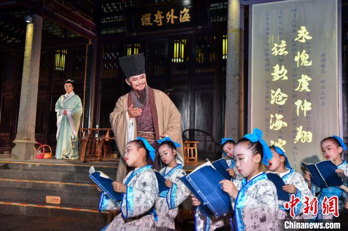 春工湖上,輕舟搖曳,昌化軍使張中扮演者吟詩(shī)而來(lái),在書(shū)院正門前迎候游人;叩門三聲,鼓樂(lè)齊鳴,書(shū)院大門開(kāi)啟,一場(chǎng)“穿越”到宋朝的沉浸演出就此展開(kāi)。