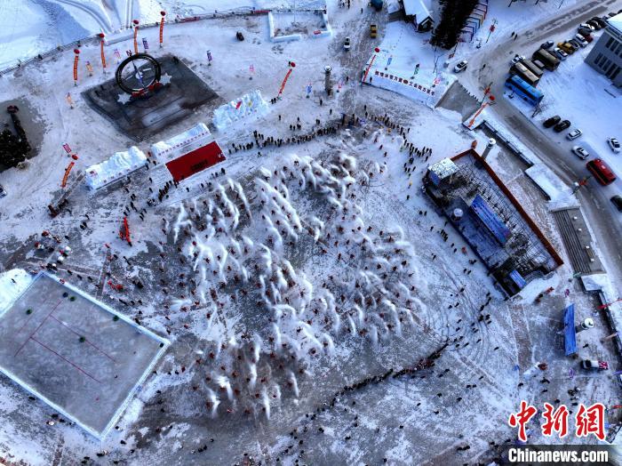 當(dāng)日,北極村七星廣場(chǎng)上,身披紅斗篷、頭戴紅帽子的游客和當(dāng)?shù)鼐用窠M成一個(gè)巨大的“53°”造型。伴隨著激情澎湃的音樂(lè),他們擺好姿勢(shì),將手中熱水奮力一灑,齊聲高喊“極致興安嶺 潑出好風(fēng)景”,一道道劃破天際的弧線,碰撞出的神奇光影。震撼的場(chǎng)面讓現(xiàn)場(chǎng)游客驚呼不已,他們紛紛舉起手機(jī)定格這個(gè)精彩瞬間。