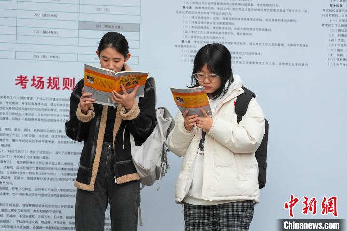 圖為考生在考場外抓緊復(fù)習(xí)。中新社記者 楊華峰 攝