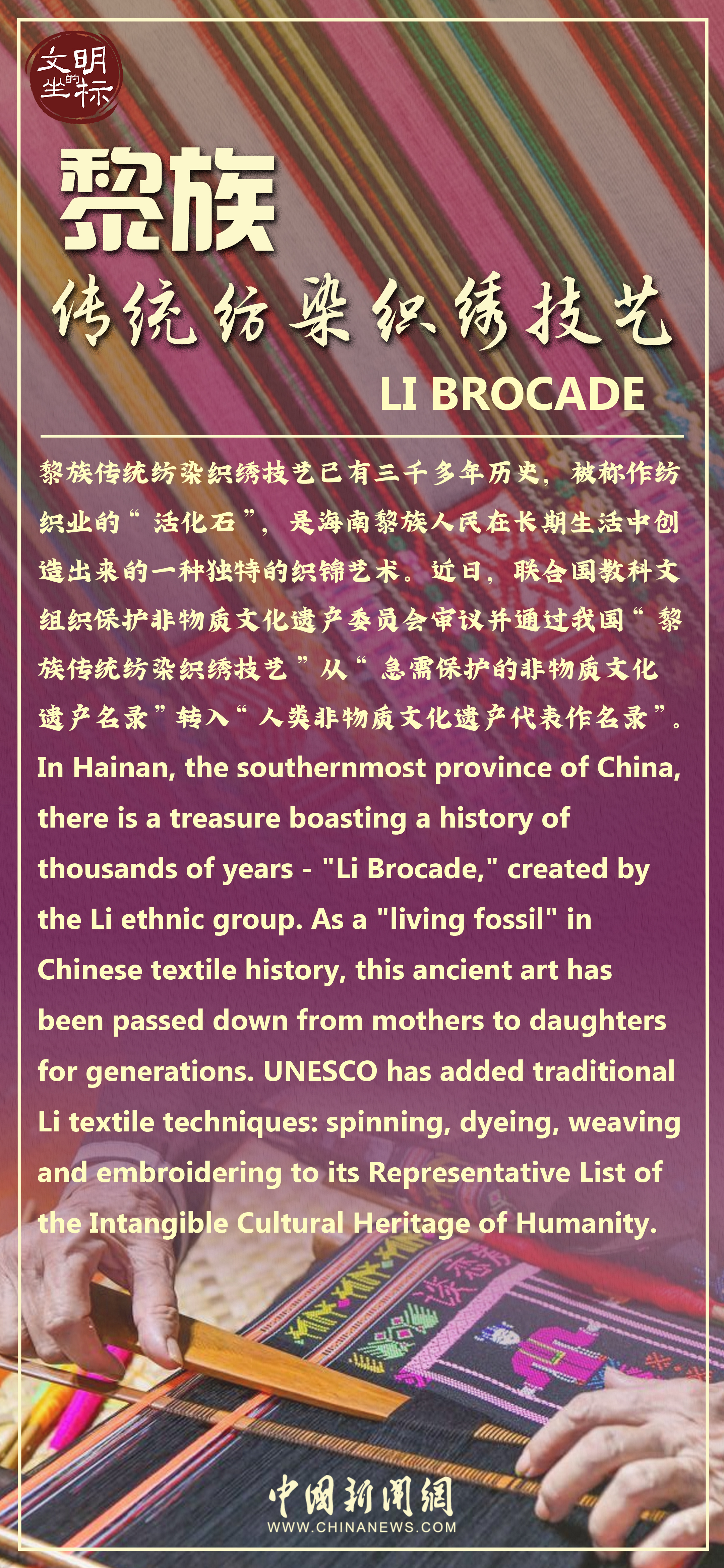 日前,黎族傳統(tǒng)紡染織繡技藝從聯(lián)合國教科文組織“急需保護的非物質(zhì)文化遺產(chǎn)名錄”轉(zhuǎn)入“人類非物質(zhì)文化遺產(chǎn)代表作名錄”,引發(fā)關(guān)注。黎族傳統(tǒng)紡染織繡技藝已有三千多年歷史,被稱作紡織業(yè)的“活化石”。對于沒有創(chuàng)造文字的黎族,黎錦像是一本“史書”,寫就了這個民族的文化和智慧。早在新石器時代,海南島上的黎族先民已會使用工具制作繩索或絲線。西漢時期,已織造出精美的“廣幅布”。至宋代,黎族的紡織達到很高水平。元代,黎族紡織工藝已傳至全國。黎族傳統(tǒng)紡染織繡技藝有麻織、棉織、織錦、印染(包括扎染)、刺繡、龍被等品種,以色彩鮮艷、圖案多樣、工藝精湛而聞名。如今,古老黎錦正穿越歷史長河,以時尚化、潮流化、年輕化的設計形態(tài)融入現(xiàn)代日常生活。