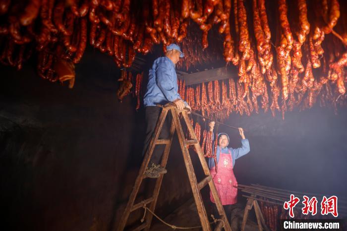 圖為貴州施秉一企業(yè)工人在下架剛熏制好的香腸。新年臨近,貴州省黔東南苗族侗族自治州施秉縣部分農(nóng)戶和企業(yè)紛紛加工趕制臘肉、香腸、血豆腐等傳統(tǒng)臘味,通過“線上+線下”銷售方式,供應(yīng)市場(chǎng),喜迎新年。磨桂賓 攝