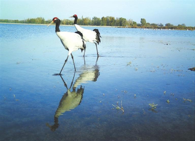 黑頸鶴在甘肅安西極旱荒漠國家級自然保護(hù)區(qū)棲息。新甘肅·甘肅日報通訊員 徐媛媛