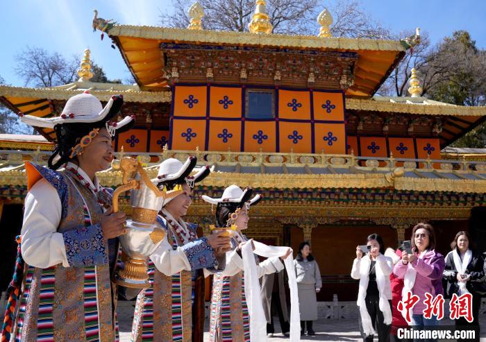 2月20日,由西藏自治區(qū)文化和旅游廳舉辦的2025年香港至拉薩航班首航旅行團(tuán)歡迎儀式在羅布林卡舉行。來自香港的游客將前往布達(dá)拉宮、大昭寺等地,開啟冬游西藏旅途。2月19日,拉薩至香港的首條地區(qū)航線正式開通。航線的開通,更加便捷了兩地居民的出行,也將進(jìn)一步促進(jìn)兩地在旅游、文化、經(jīng)貿(mào)等領(lǐng)域的交流與合作。圖為歡迎儀式現(xiàn)場(chǎng),工作人員向香港游客敬獻(xiàn)青稞酒。中新社記者 李林 攝