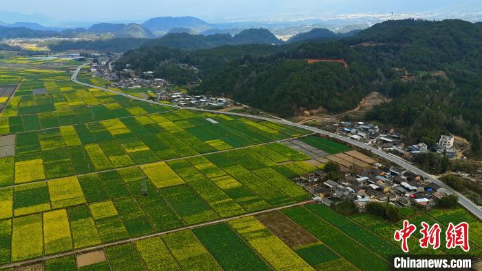 近日,云南省騰沖市界頭鎮(zhèn)成片的油菜花盛開(kāi),吸引不少游客前來(lái)觀光。金黃的油菜花海與遠(yuǎn)處白墻黛瓦的村落相映成趣,共同繪就一幅寫(xiě)意的水墨畫(huà)。圖為油菜花田航拍。趙輝  攝