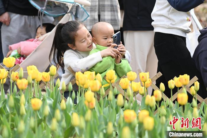 3月16日,位于湖南長沙的湖南省植物園數(shù)十萬株郁金香肆意綻放,五彩斑斕的花瓣交織成一片絢麗花海,引得眾多游人紛至沓來,享受愜意春日。圖為游人置身花叢中。中新社記者 楊華峰 攝