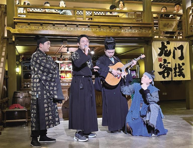 “諸位小友近來(lái)可好?”“好!”在街區(qū),NPC們與游客的互動(dòng)成為一大亮點(diǎn)。為了讓游客更好地沉浸其中,街區(qū)里的“蘭裳閣”專門提供服裝出租和妝造設(shè)計(jì)服務(wù)。游客們?cè)谶@里換上漢服、做好造型,“穿越”成古人與NPC們共同沉浸在這場(chǎng)歷史旅行中。張偉彥在“龍門客棧”工作快半年了,飾演店小二馬一刀。他對(duì)角色有著自己的理解:“導(dǎo)演讓我演店小二,大家印象里店小二都是機(jī)靈、腿腳快的。但我演的這個(gè)店小二帶著江湖氣息,他藏在龍門客棧,其實(shí)是個(gè)刀客,在這里打工是為了打探消息,畢竟龍門客??墒墙⒌木奂亍?rdquo;記者走在街區(qū),時(shí)不時(shí)就能看到他拿著草帽,熱情地招呼游客玩接帽子游戲。遇到靦腆不敢嘗試的游客,他也會(huì)不斷鼓勵(lì),有時(shí)候碰上外國(guó)游客,他還隨口說(shuō)幾句英語(yǔ)與其互動(dòng)。